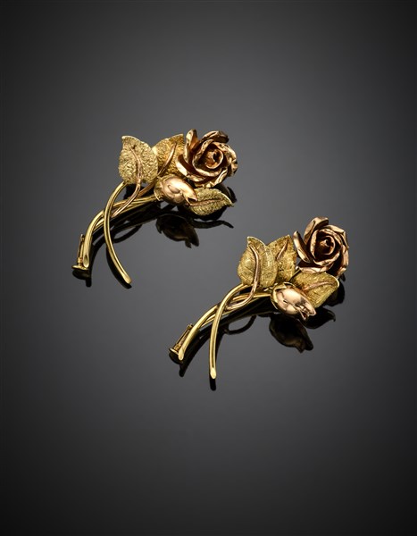 Coppia di spille a guisa di rosa in oro giallo e rosso 585/1000, complessivi g 9,44 circa, lungh. cm 3,90 circa. Marcate HL.