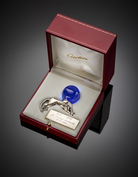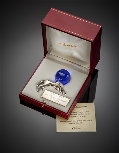 Fermacarte Panthère in argento 925/1000 con boule in cristallo blu, g 95,68 circa, lungh. cm 5,90 circa. Firmato Cartier. In scatola originale Cartier con dedica a Lo Scenario Ambrosetti