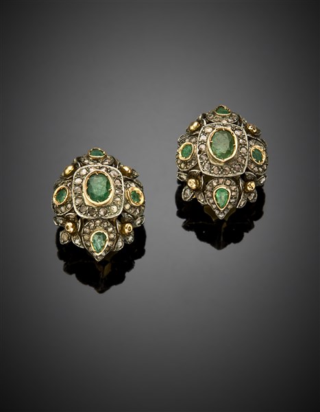 Rose cut diamond and emerald silver and 9K gold earclips, g 22.68 circa, length cm 2.70 circa. (slight defects)