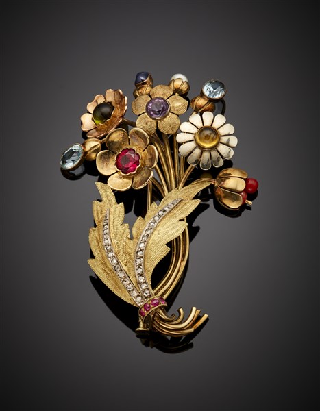 Bi-coloured 9K gold flower brooch accented with diamonds, sapphire, corals and various partly synthetic gems, g 20.33 circa, length cm 6.80 circa. Austrian marks. (defects and losses)