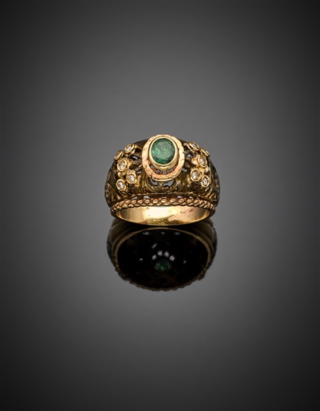 Anello in oro giallo 333/1000 e argento rifinito con diamanti e uno smeraldo ov