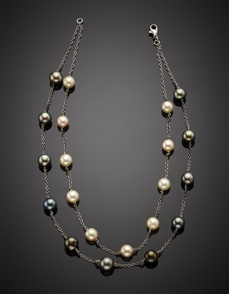 Collier a due fili in perle bianche, grigie e nere coltivate da mm 8 a mm 9,60 circa distanziate da catenina in oro bianco come la chiusura, g 28,72 circa, lungh. cm 42 circa.