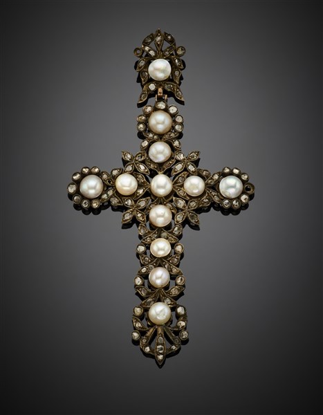 Croce pendente in oro 300/1000, argento, diamanti a mezza rosetta, paste vitree e perle blister, g 16,36 circa, lungh. cm 9,50 circa. In scatola originale (mancanze)