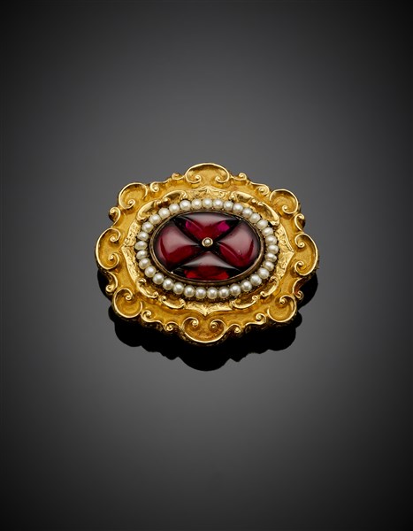 Spilla in oro giallo 750/1000, 333/1000 sbalzato e cesellato e argento rifinita con grandi granati cabochon e perle, incisione sul retro , rinforzata all'interno, lordi g 24 circa, lungh. cm 4,80 circa. (difetti)