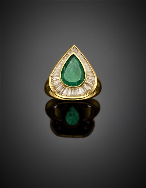 Pear shape ct. 1.75 circa emerald and tapered diamond yellow gold ring, diamonds in all ct. 2.00 circa, g 11.88 circa size 16/56.