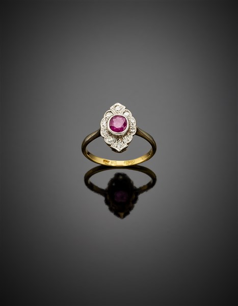 Anello in oro giallo e bianco con rubino di ct. 0,50 circa e diamanti a rifinir