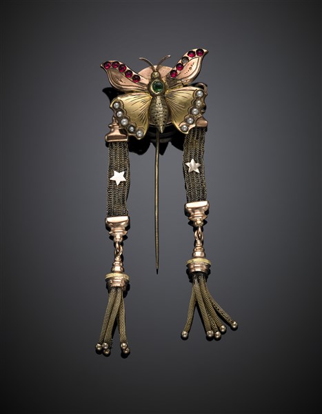 Two colour 9K and 18K gold butterfly hat pin with pendant tassels and accented with red paste and seed pearl, metal pin, gross g 15.90 circa, length cm 9.30 circa. (defects and losses).