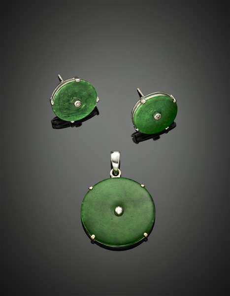 Lotto in oro bianco 333/1000 e giadeite tinta composto da un pendente di cm 2,70 circa e orecchini a lobo di cm 1,30 circa, complessivi g 4,04 circa.