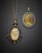 Lot comprising a silver chain and two pendants with miniatures, synthetic gems, chalcedony and 9K gold details, one pendant wearable also as a brooch, chain cm 61.20circa, the pendants cm 6.10 and cm 5.10 circa, in all g 25.40 circa. Chain marked 37 AR, one pendant marked 14 MI. (defects)