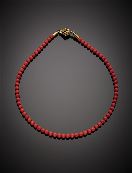 Collana in boules di corallo rosso di mm 6 circa con chiusura in metallo dorato, g 22,65 circa, lungh. cm 45,50 circa. (lievi difetti)