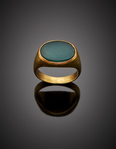 Cryptocrystalline green quartz yellow gold ring, g 9.22 circa size 20/60. (slight defects)