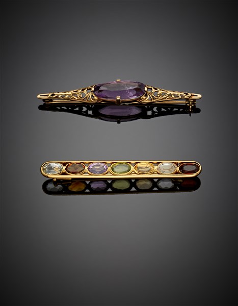 Lotto composto da due spille a barretta in oro giallo e gemme varie di cm 4,70 e cm 5 circa, complessivi g 5,77 circa.