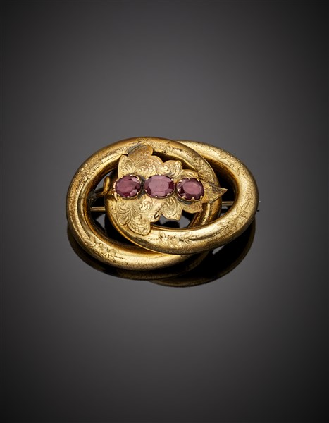 Lot 1594 | Spilla a nodo in oro giallo 300/1000 con tre granati, g 18,73 circa, largh. cm