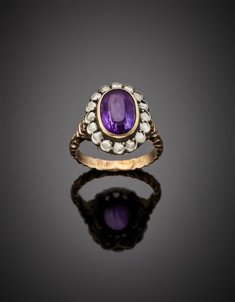 Anello in oro 333/1000 e argento, al centro un'ametista ovale rifinita con diamanti a mezza rosetta, g 5,63 circa misura 16/56.