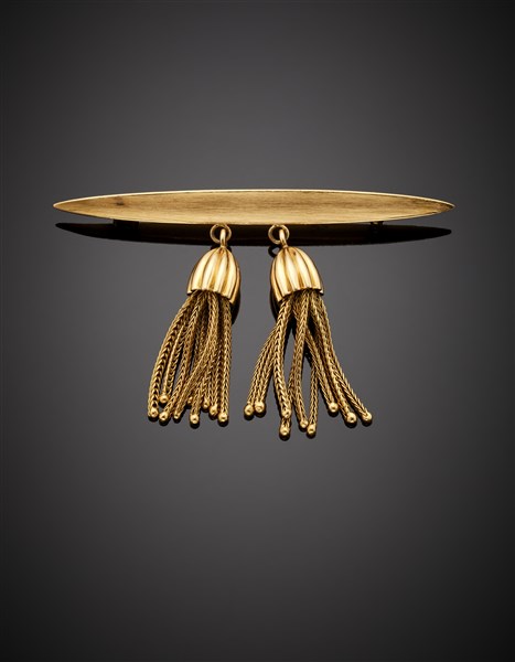 Spilla in oro giallo con due nappe, g 8,24 circa, lungh. cm 3,80, largh. cm 6 circa. (lievi difetti)