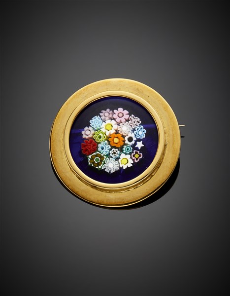 Spilla rotonda in oro giallo con murrina a fondo blu, g 10,47 circa, diam. cm 3,10 circa.