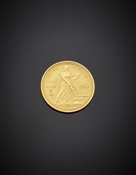 Riproduzione in oro giallo 917/1000 di una moneta da venti Lire di Vittorio Emanuele III, 1912 Regno d’Italia, conio 1995, g 6,19 circa, diam. cm 2,10 circa.
