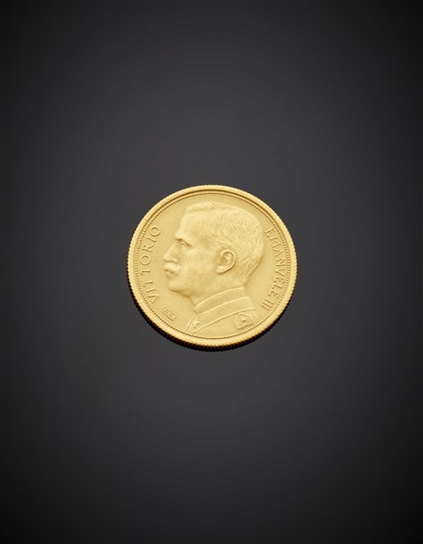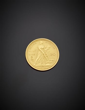 Yellow 22K gold reproduction of a Vittorio Emanuele III twenty Lire coin, 1995 issue, g 6.19 circa, diam. cm 2.10 circa.