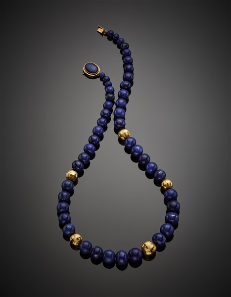 Collana a scalare in boule di lapislazzuli da mm 5.60 a mm 12.80 circa con distanziatori e chiusura in oro giallo, g 86,43 circa, lungh. cm 53 circa. (difetti)