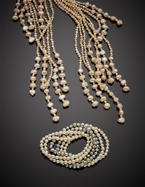 Lotto in perle coltivate d'acqua dolce composto da sei bracciali elastici con diam. cm 6 circa, con nove collane lungh. compresa tra cm 119 e cm 121,5 circa, tutti senza chiusura, complessivi g 253,27 circa.