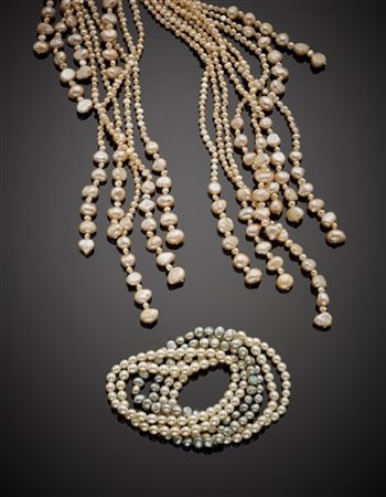 Freshwater pearl lot comprising six elastic bracelets diam. cm 6 circa, with nine long necklaces, length between cm 119 and cm 121.50 circa, all without clasps, in all g 253.27 circa.