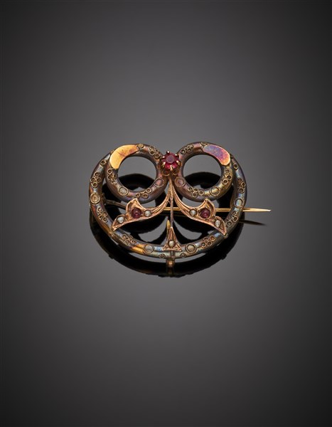 Yellow 9K gold red paste and small pearl brooch, 18K gold pin, g 4.30 circa, width cm 3.20 circa. (defects)