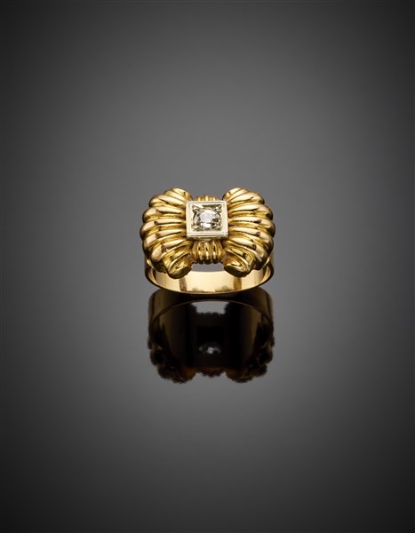 Anello in oro giallo a fiocco con diamante al centro, dettagli in oro bianco, g 4,85 circa misura 16/56. Marchio con il "Fascio".