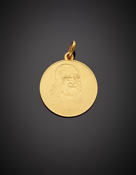 Yellow glazed gold pendant celebrative medal of the "Consiglio Nazionale degli Ingegneri", dedicated to "Cesare Romiti Cavaliere del Lavoro" g 10.79 circa, length cm 4.10 circa. Marked 121 MI.