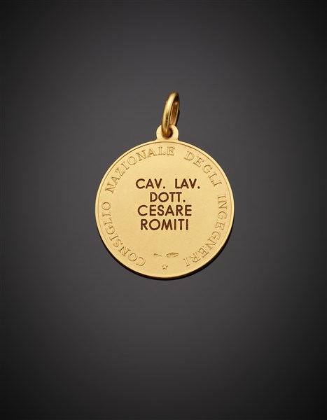 Medaglia pendente commemorativa in oro giallo satinato del “Consiglio nazionale degli ingegneri”, dedicata a "Cesare Romiti Cavaliere del Lavoro", g 10,79 circa, lungh. cm 4,10 circa. Marcata 121 MI.