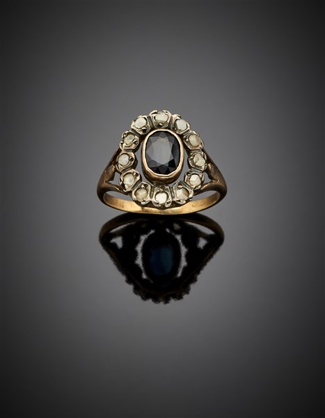 Anello in oro giallo e argento con zaffiro ovale e diamanti a mezza rosetta, g 4,23 circa misura 13/53.