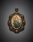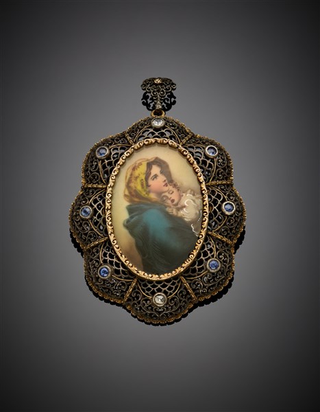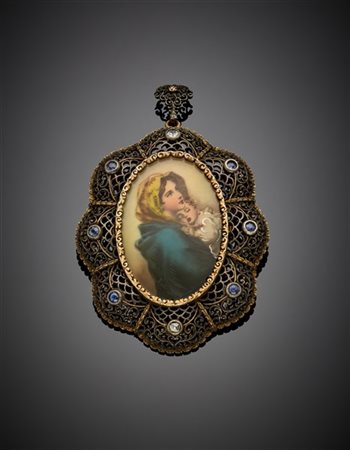 Broche/medaglione lavorato a traforo in oro e argento con zaffiri e diamante a mezza rosetta, al centro una miniatura, dettaglio in pasta vitrea, g 26,38 circa, lungh. cm 7,70 circa.