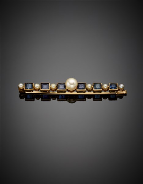 Spilla a barretta in oro giallo 585/1000 con zaffiri carré e perle, g 7,02 circ