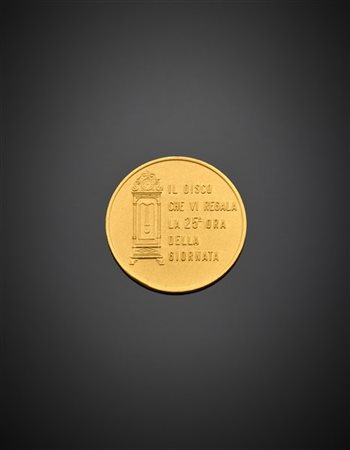 Moneta commemorativa "Istituto internazionale del disco" in oro giallo punzonato 1000 in losanga e 38 MI g 7 circa, diam. cm 2,5 circa.