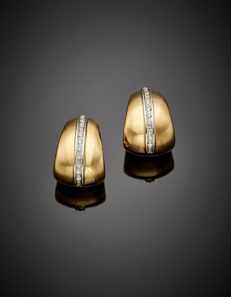 Yellow gold small diamond earclips, white gold details, g 10.69 circa, length cm 1.70 circa. Marked 1070 MI.
