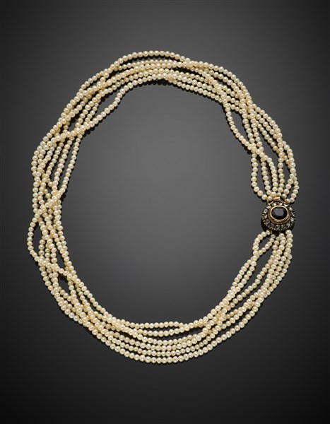 Collana a sei fili di perle coltivate di mm 2.80/3.00 circa, con chiusura in oro giallo e argento rifinita con diamanti a mezza rosetta e zaffiro di ct. 1,60 circa, g 31,70 circa, lungh. cm 41,70 circa.