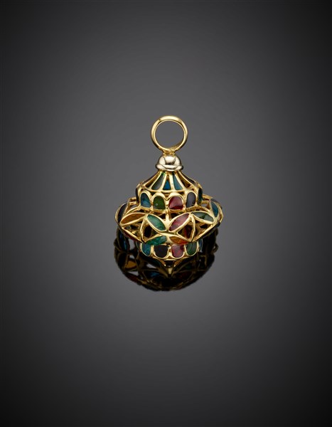 Pendente in oro giallo con smalti cattedrale, dettaglio in oro bianco, g 6,42 c