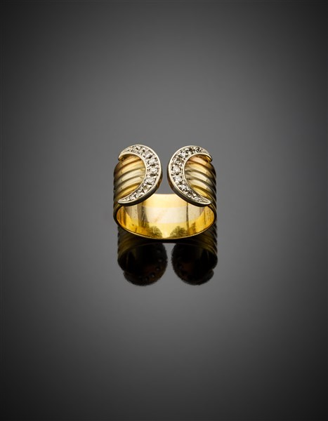 Anello in oro a tre colori rifinito con diamanti, g 6,42 circa misura 17/57.