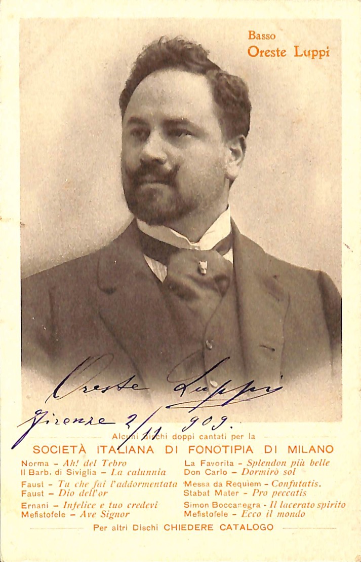 Ritratto del basso italiano con autografo datato Firenze 2 novembre 1911 su cartolina ufficiale della Società di Fonotipia di Milano.