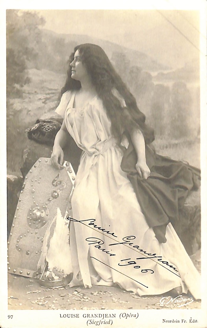 Ritratto della soprano francese in vesti di scena nel Sigfried con autografo datato Paris 1906.