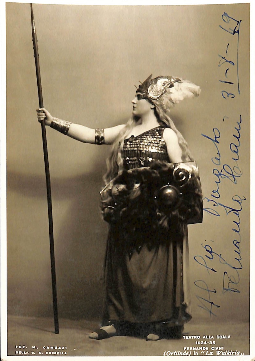 Ritratto del soprano italiano in vesti di Ortlinde nella Walkiria con dedica autografa datata 31 agosto 1949.