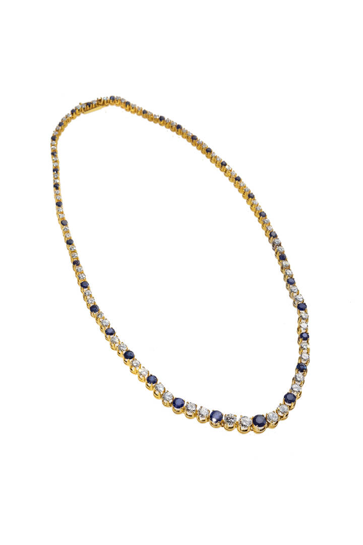 in oro giallo, modello tennis, con diamanti taglio brillante per totali ct 4,80 ca, probabile colore G-H, purezza IF-VVS e zaffiri taglio rotondo per totali ct 3,50 ca
