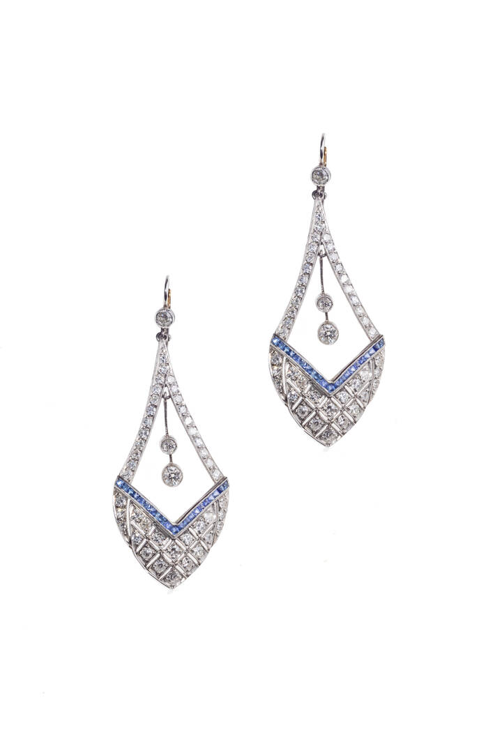 pendenti, in oro bianco e giallo, anni '20, a losanga, in diamanti taglio 8/8 e vecchio per totali ct 2,50 ca e zaffiri taglio carré per totali ct 0,50 ca