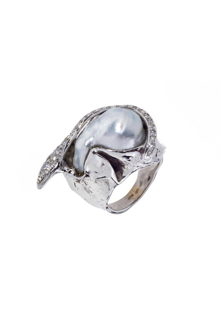 in oro bianco con perla australiana centrale scaramazza e inserto a forma di serpente in diamanti taglio brillante per totali ct 0,25 ca