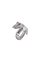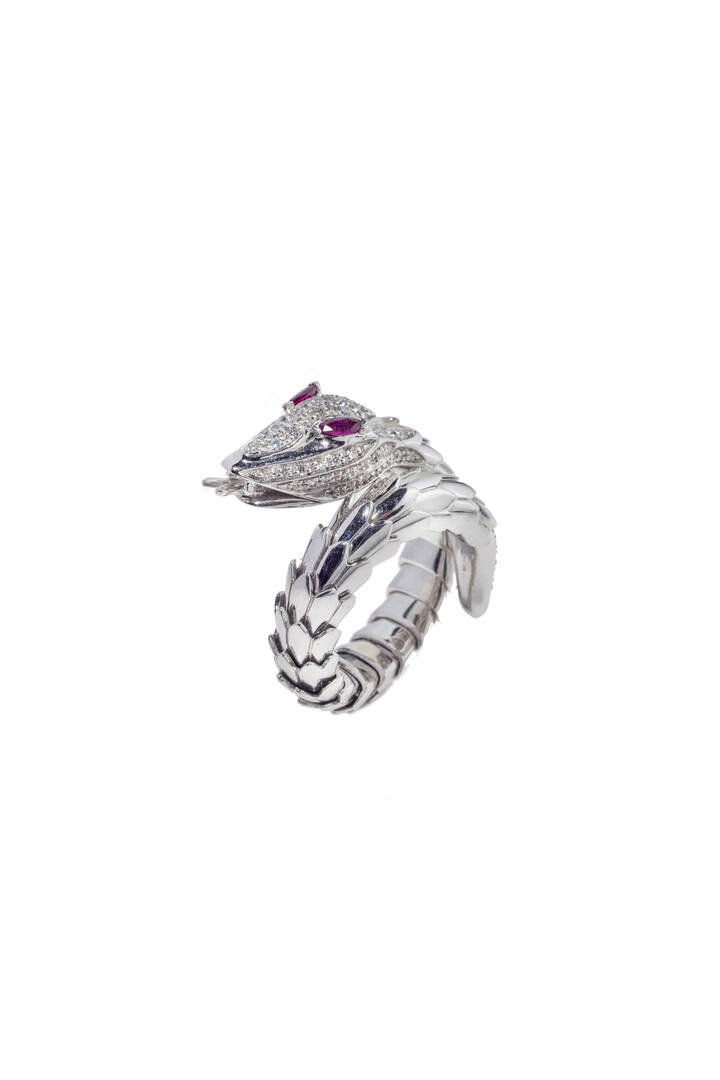 in oro bianco, a forma di serpente, testa con due rubini taglio navette come occhi per totali ct 0,14 ca e diamanti taglio brillante per totali ct 0,60 ca, probabile colore G-H, purezza IF-VVS