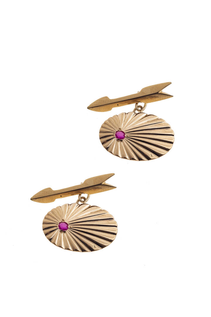 in oro 9 Kt, di forma ovale lavorati a righe con due rubini sintetici