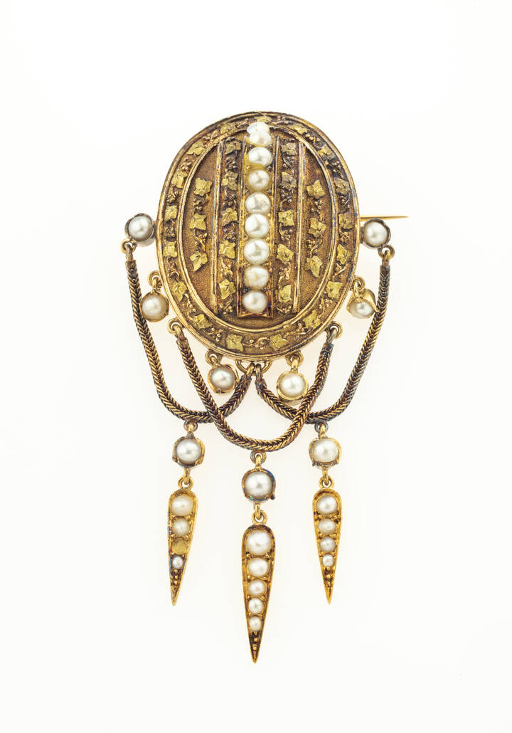 XIX secolo, in oro 9 Kt, di forma ovale con frange recanti perline (una mancante)