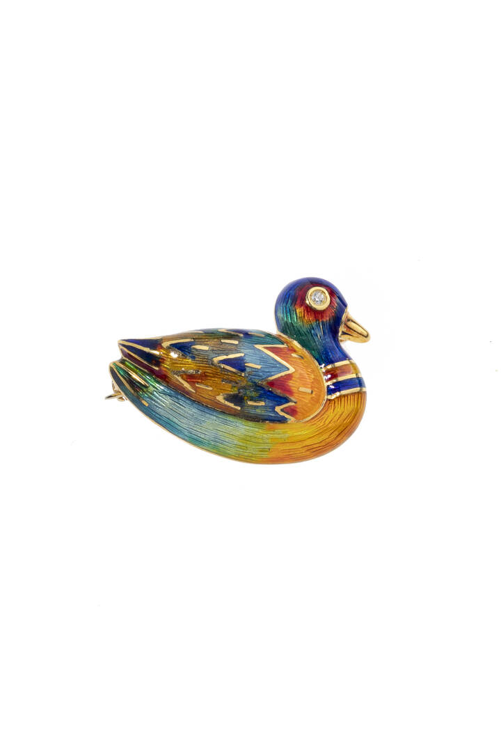 in oro giallo, a forma di germano, interamente smaltata con smalti policromi; un diamantino come occhio