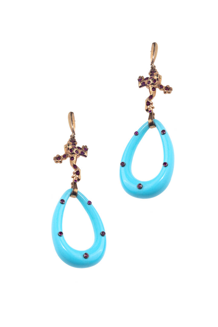 pendenti in argento rodiato nei toni del rosa, con ranocchie trattenenti anelli in pasta di turchese