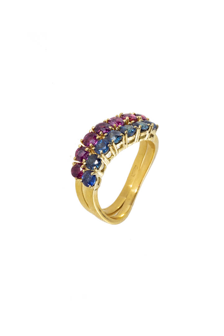 composto da due fedine mosse in oro giallo una con fila di zaffiri taglio rotondo per totali ct 1,0 ca e rubini taglio rotondo per totali ct 1,0 ca