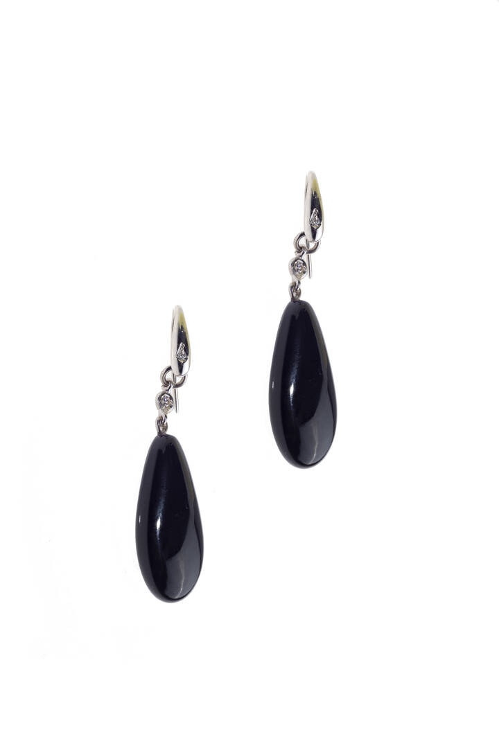 in oro bianco, ad amo, con gocce cabochon di onice. Piccoli diamantini taglio brillante per totali ct 0,08 ca